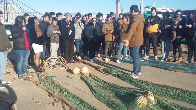 Por la tarde el alumnado y el profesor tutor visitaron la lonja de pescado de Dénia, donde tuvieron la oportunidad de ver la llegada de las barcas, la descarga de las capturas, la clasificación de la pesca del día y el funcionamiento de la subasta electrónica. La visita estuvo guiada por Jordan Labios, quien hizo un resumen de la tradición pesquera de Dénia y de sus peculiaridades, además de describir las artes utilizadas habitualmente: arrastre, tresmall y palangre.