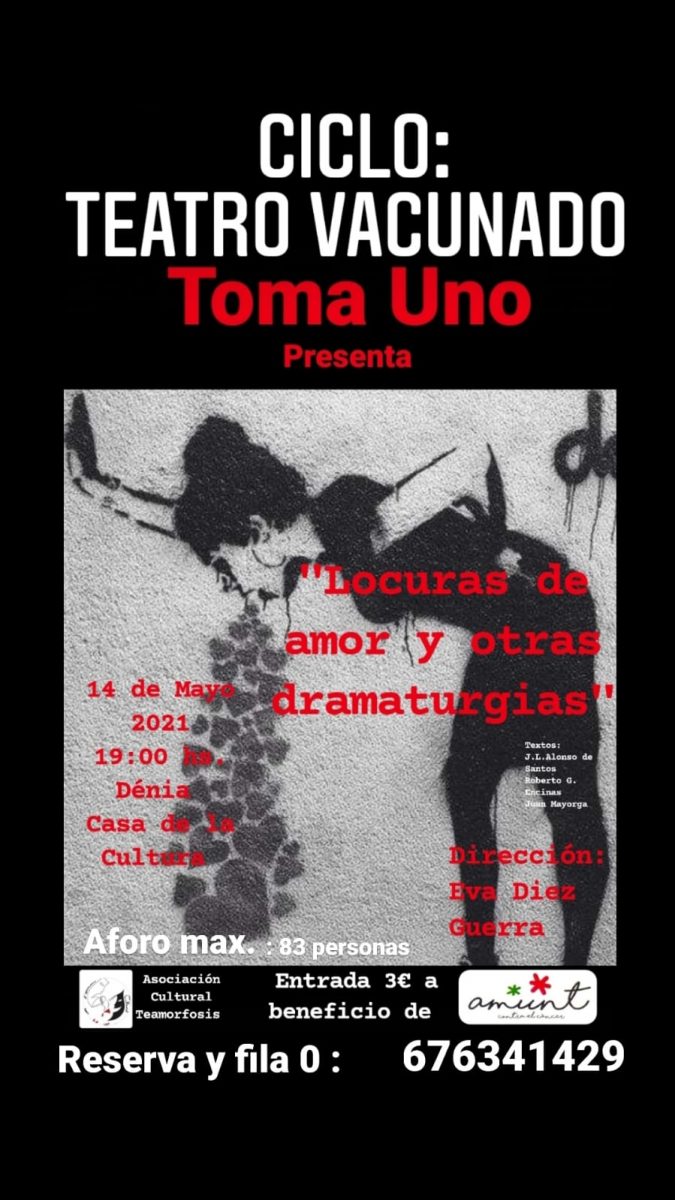• 14 de mayo, el grupo de teatro “TOMA UNO” pondrá en escena “LOCURAS DE AMOR Y OTRAS DRAMATURGIAS”. Se compone de una serie de pequeñas historias de autores como: J.L. Alonso de Santos, Roberto G. Encinas y Juan Mayorga. Estas divertidas historias están dirigidas por Eva Diez Guerra.