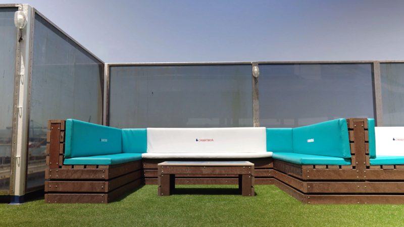 Baleària y Cabreiroá han reciclado más de 7.000 kg de plástico para crear mesas, sillas y bancos destinados a las terrazas exteriores de algunos barcos de la naviera, como el Abel Matutes y más recientemente el Martín i Soler, que además navegan a gas natural, un combustible más limpio.