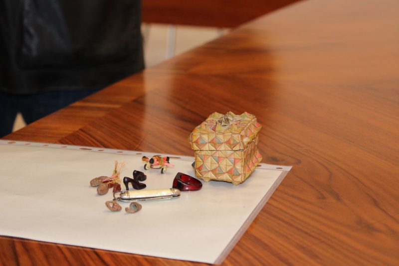 Los objetos dados son una cajita fabricada con tiras de piel de colores, un pequeño avión sujeto a un imperdible para prenderlo en la ropa, un anillo, zuecos de madera, unos zapatitos de tacón y dos cestas.
