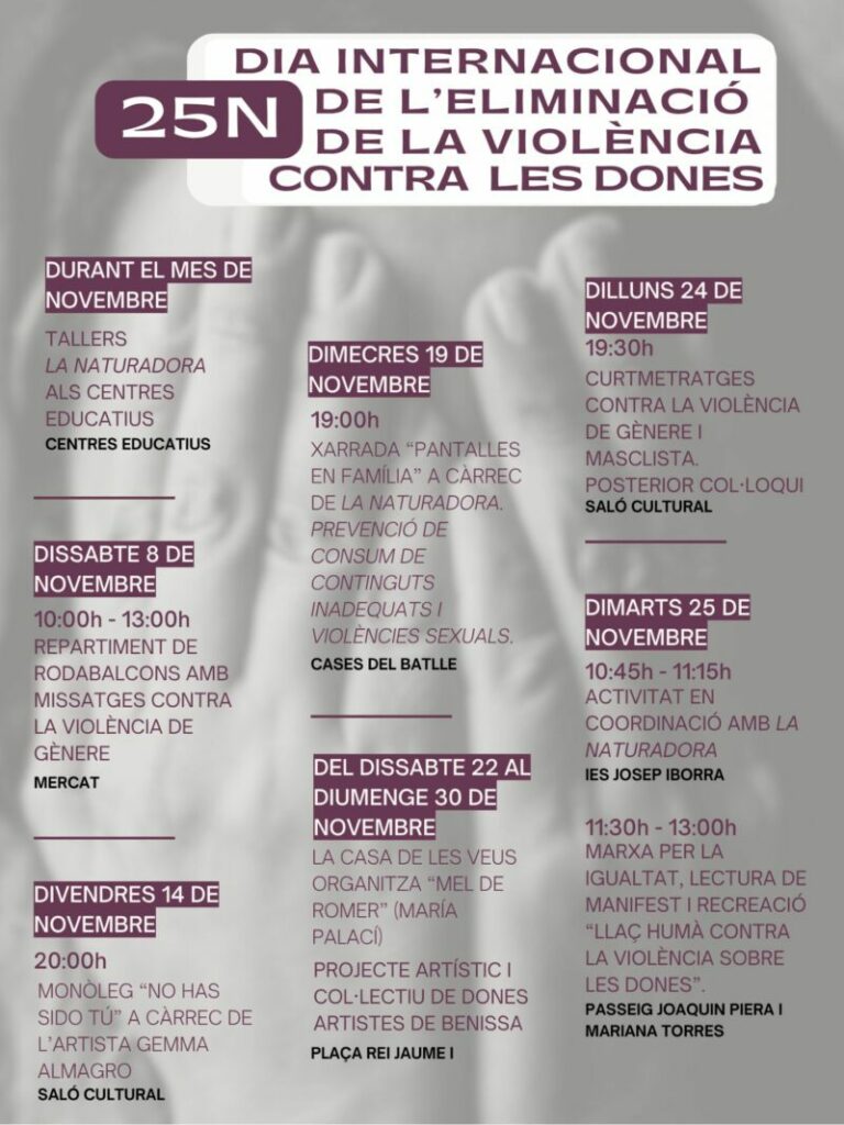 El Ayuntamiento de Benissa, a través de la Concejalía de Igualdad, presenta una amplia programación con motivo del Día Internacional de la Eliminación de la Violencia contra las Mujeres (25N), con actividades que se desarrollarán del 14 al 30 de noviembre. Las propuestas buscan sensibilizar a la ciudadanía desde diferentes ámbitos —la educación, la cultura y la participación social— para promover una sociedad libre de violencias machistas.
