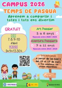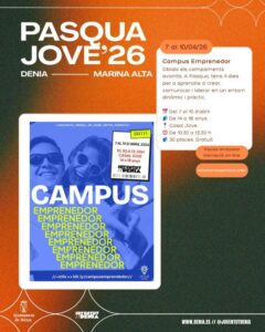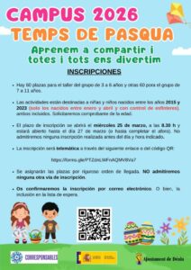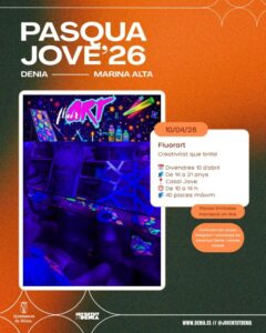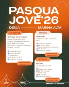 Bienestar Social ha organizado campus Pascuero para diferentes franjas de edad. “Art pasqüer”, para niñas y niños de 3 a 6 años, que se desarrollará en el colegio Cervantes; “Aventura pasqüera”, para participantes de 7 a 11 años, que se hará en la Casa de Cultura; y los campus deporte playa y campus creativo, dirigido a participantes de 12 a 16 años, que tendrán lugar a las instalaciones de Juventud y en las playas de Dénia.