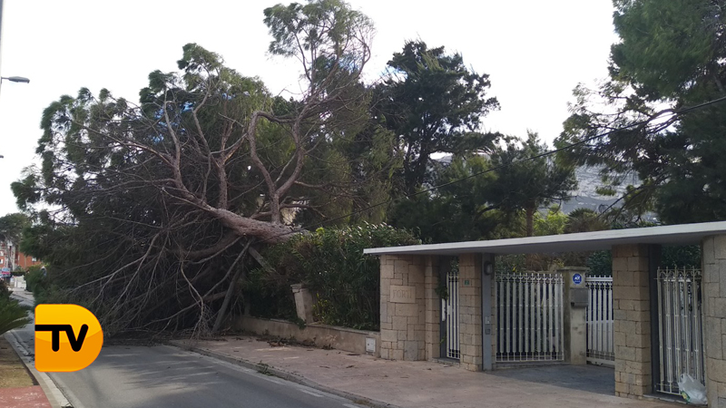 Desde primera hora de la mañana las fuertes rachas de viento están azotando la costa de Dénia y la Marina Alta. Tras cerrar algunos jardines y calles por la caída de varios pinos o placas metálicas, ahora ha sido un pino centenario el que ha caído en la Finca El Fortí, entre la rotonda del Club Náutico y la calle Aldeberan, por lo que la Policía Local de Dénia ha cortado el tráfico en dirección Les Rotes.