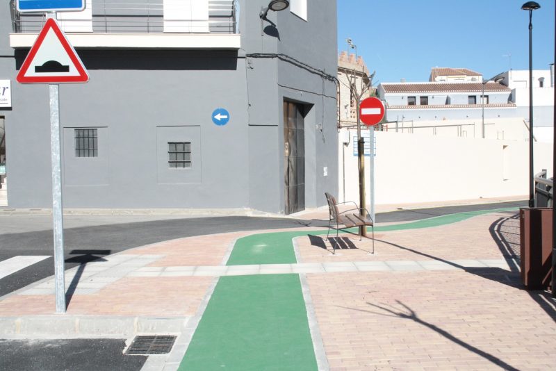 La actuación ha creado un acceso y recorrido para peatones en condiciones de seguridad, funcionalidad y accesibilidad universal con una mejora ambiental, dotando al municipio de un recorrido más funcional y desarrollado para los peatones desde la entrada oeste del casco urbano hasta llegar al centro del pueblo. La actuación realizada ha incluido la plantación de nuevo arbolado y el cambio del alumbrado público, con la instalación de luces LED de bajo consumo. El proyecto comienza en la zona verde existente en la calle Picasso, y que conforma la entrada para peatones desde Pamis y el Polideportivo. Las obras, en este punto, han comprendido la remodelación del aparcamiento situado en la calle Picasso. Ello se debe a que la creación del Espai Jove (actualmente en construcción) en esa zona está suponiendo una modificación de todo el área, con la necesidad de disponer de unos accesos adecuados. Los pasos de peatones se han hecho elevados para reducir la velocidad de los vehículos. El recorrido continúa hasta la Av. Dr. Fleming, en donde se ha colocado un paso de peatones elevado. Sigue por el pasaje hasta la calle Pintor Segrelles. En la calle Pintor Segrelles la mejora ha comprendido una remodelación de la plaza triangular. En este área, y también en la parte posterior de la plaza de toros, se ha reordenado el aparcamiento, creando plazas para personas con movilidad reducida, y se han colocado aceras amplias para dotar de seguridad al peatón, así como un carril bici, de color verde, que está integrado en la acera durante todo el recorrido y que llega hasta al Prado.