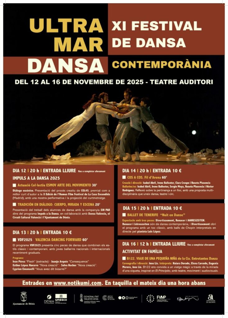 La undécima edición de Ultramar Danza, el festival de danza contemporánea de la ciudad de Dénia, se celebra del 12 al 16 de noviembre de 2025. Los espectáculo tendrán lugar en el auditorio del Centro Social, a las 20 horas, exceptuando lo del domingo 16, dirigido al público infantil y familiar, que empezará a las 12 del mediodía, como parte de la programación de Actividades en familia de la Concejalía de Cultura.