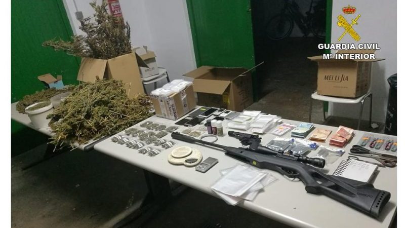 Como resultado de realizar la entrada y registro de su domicilio, se ha intervenido un total de 2.787 gramos de marihuana, 17 dosis embolsadas, preparadas para su inmediata distribución, 1060 euros en efectivo, utensilios para la manipulación de la sustancia estupefaciente, además de 6 teléfonos móviles, 1 escopeta y 1 revólver de aire comprimido y 12 cartuchos de gas.