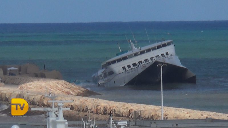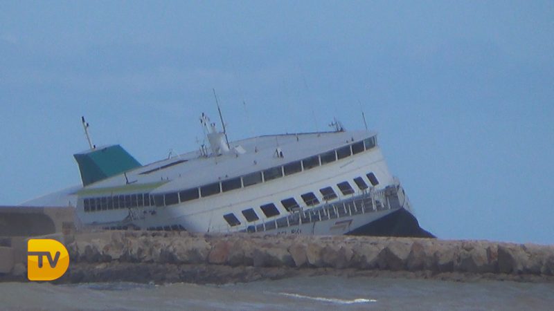 Con el temporal sufrido esta noche el ferry de Baleària se ha escorado contra la escollera, y parece que se este hundido, aunque de momento no es así. Golpeado y encajado en las piedras, el barco ha cambiado su imagen y su perspectiva, hundiéndose más de estribor.