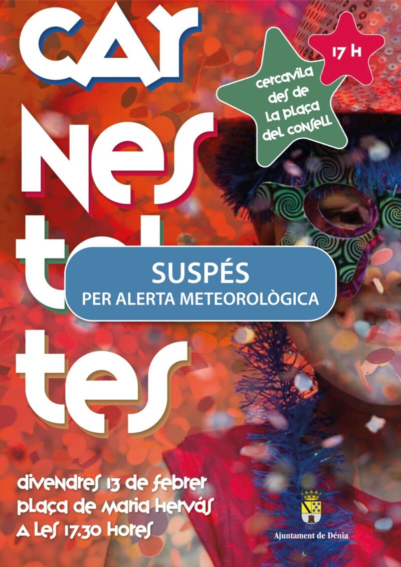 Ante la previsión meteorológica de alerta por fuertes vientos, que pueden alcanzar los 80 km/h, la Concejalía de Fiestas ha decidido suspender la fiesta de carnaval infantil prevista para mañana viernes, 13 de febrero, a las 17.30 horas, en la plaza María Hervás.