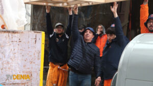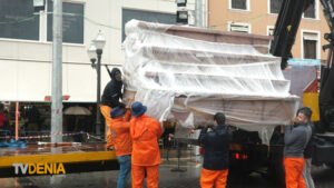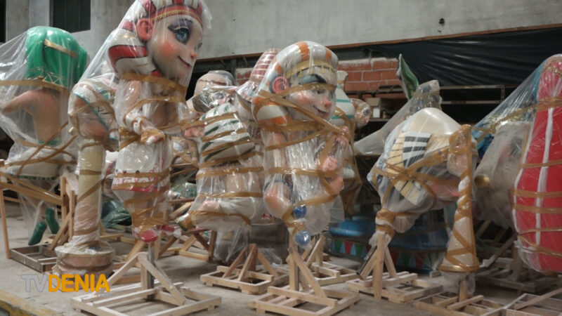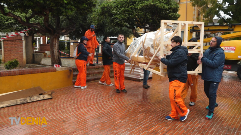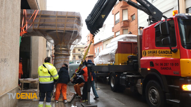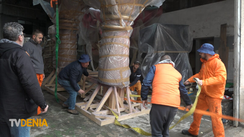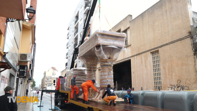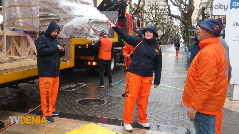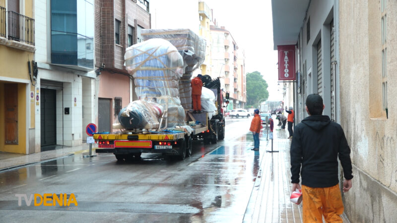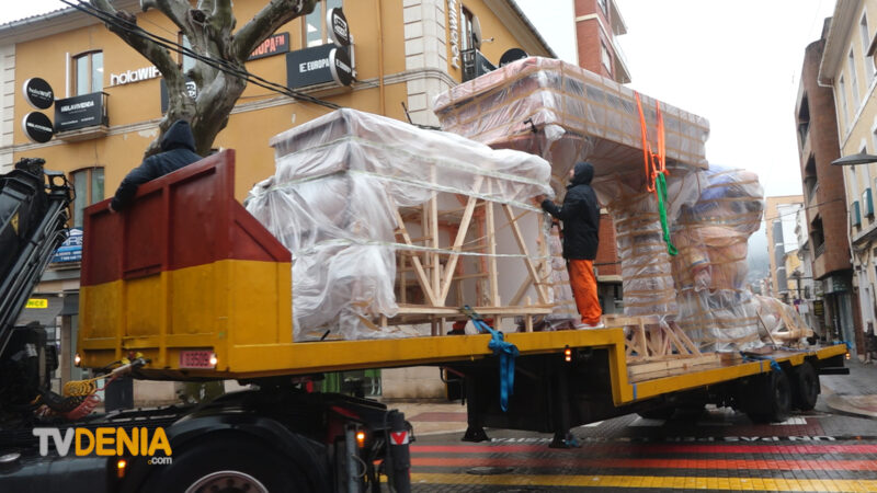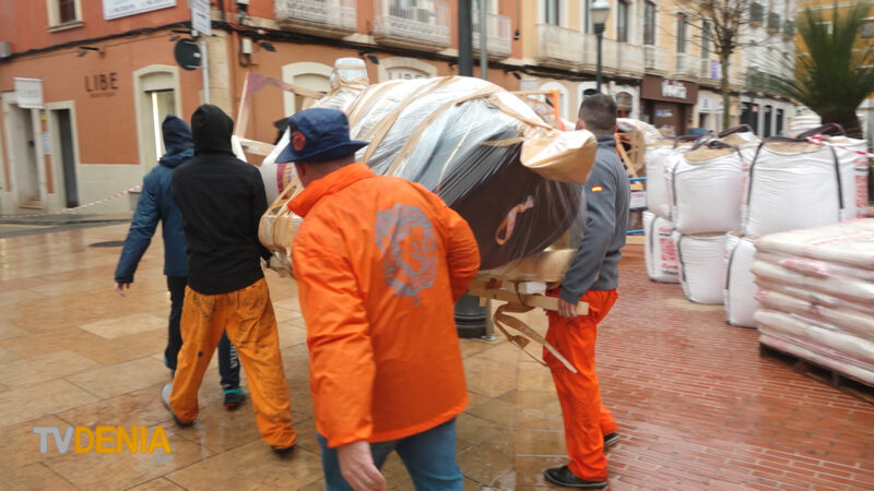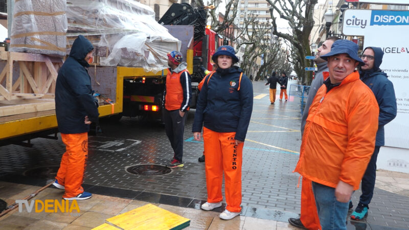 El centro de Dénia ya empieza a vestirse de fallas. La Falla Centro ha sido la primera de las once comisiones falleras de la ciudad en comenzar a descargar sus ninots. Previsores, y también algo atrevidos, falleros y falleras han salido hoy a la calle para ayudar en el traslado de las piezas del monumento, a pesar de que la meteorología no era la más favorable para iniciar los trabajos. A lo largo de toda la jornada, los ninots se irán trasladando desde la nave hasta La Glorieta, la céntrica plaza donde se planta la falla.