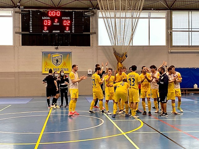 Desde el inicio y dado el momento de la competición en que no encontramos, ambos conjuntos salieron volcados en busca de la portería rival. Las ocasiones no se hicieron esperar y con un fuerte ritmo de partido ponían una y otra vez a prueba a los porteros. El Mar Dénia fiel a su juego intentaba salir con el balón controlado desde su área, mientras el conjunto visitante con un juego más directo ejercía una fuerte presión por todo el campo y lanzaba rápidas contras. En el minuto 6 tras un saque de esquina llegaba el 0-1. Una vez más tocaba remontar, pero en ésta ocasión con ambos equipos volcados en el ataque, la igualada no se hizo esperar y dos minutos después Jaume de fuerte tiro exterior conseguía el 1-1. Los ataques eran continuos y la fuerte presión por todo el campo cargaba de faltas a ambos conjuntos. En el minuto 15 una buena triangulación entre Toni, Jaume y Omar servía para que éste último marcara y pusiera el 2-1 en el marcador. Resultado con el que se llegaba al descanso del partido.