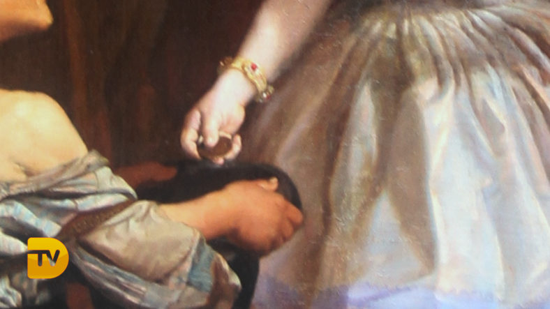 A su izquierda, tres niños harapientos a quienes entrega una moneda en la que se aprecia la efigie de la reina Isabel II, “un guiño del pintor a la monarca, a la que deseaba obsequiar con el cuadro”. A su derecha, un niño medio desnudo, pobre, quizás tullido, que con su actitud de testigo mudo recuerda a personajes que, como un fauno o el dios Pan, están presentes en grabados del Renacimiento.