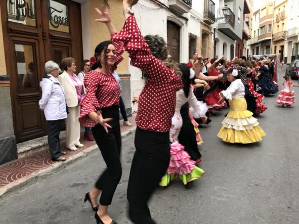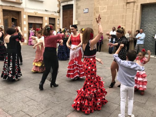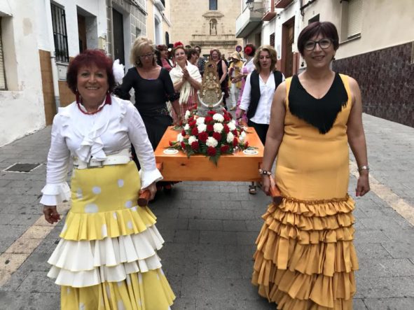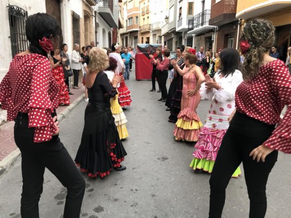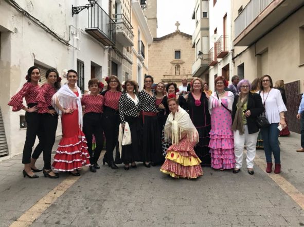 Más de un centenar de vecinos se unieron el pasado sábado, 2 de junio, a la fiesta que la Casa Rociera de El Poble Nou de Benitatxell celebra en honor a la Virgen del Rocío. La fiesta comenzó a las 18:30 con una concentración en el casal seguida de una misa en honor a nuestra señora del Rocío. Tras la eucaristía, las “rocieras” animaron a los asistentes con sus bailes en la plaza de la Iglesia para continuar en la calle Mayor. La amenaza de lluvia no consiguió empañar la jornada andaluza y al final los vecinos salieron a la calle con el “sopar de cabasset” y más música y diversión amenizados por la actuación de “Suspiros de Arte”. El ambiente animó a los asistentes a atreverse con cantos andaluces y a bailar alguna que otra sevillana.