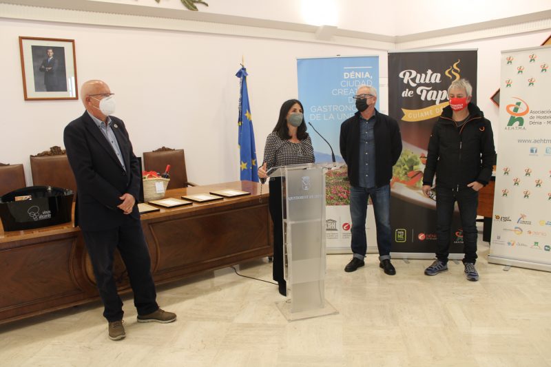 Los premios de la 18.ª edición de la Ruta de Tapas GuiaME Dénia se han entregado en un acto en el que han participado el alcalde y concejal de Turismo, Vicent Grimalt, los organizadores Manolo y Frank Martí, de GuiaME Comunicació, Diego Mena, directivo de la Asociación de Empresarios de Hostelería y Turismo de la Marina Alta (Aehtma) y representantes de las empresas colaboradoras de la iniciativa.