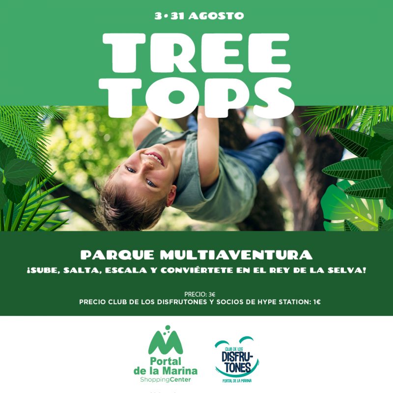 Del 3 al 31 de agosto, Portal de la Marina contará con una actividad basada en el reto: Tree-Tops. Un parque multiaventura formado por 6 zonas en las que los niños podrán jugar durante 25 minutos con las medidas de protección necesarias y la altura mínima requerida para esta actividad: 1,40 con el brazo estirado.