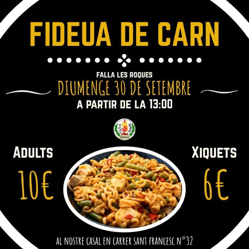 A més a més, el dissabte obríem les portes del nostre casal, per ha rebre la festa Jove amb el sopar italià, és la millor idea per a passar una nit de festa al nostre casal; i com ja sabeu, quan comencem, açò és un no parar! I per això ens complau anunciar que el pròxim Diumenge 30 de setembre, celebrem un dinar molt de la terra i és que el dedicarem al tradicional plat de «fideua de carn» tot una delícia per als amants de la cuina tradicional.