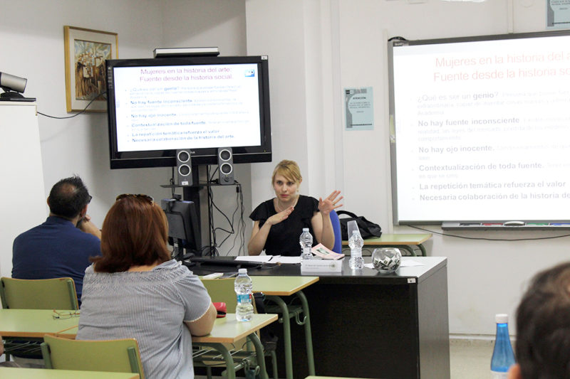 La ponencia de María del Carmen Server Arbona, cuyo título fue “La creación artística, un difícil sustantivo femenino” empezó con la pregunta “¿Por qué no ha habido grandes artistas femeninas?” de Linda Nochlin. Con esta pregunta que se realizaba en el año 1971 la historiadora, que cuestionó no solo las desigualdades de un sistema que frenaba el desarrollo de las artistas, sino también las normas sociales que durante siglos habían conducido a “la exaltación de la figura mítica del hombre artista”, haciendo de su punto de vista “el único punto de vista”, se dio comienzo a esta charla en la que se analizó directamente al sujeto creador con una clara visión masculina, a la representación femenina a lo largo de la historia del arte.
