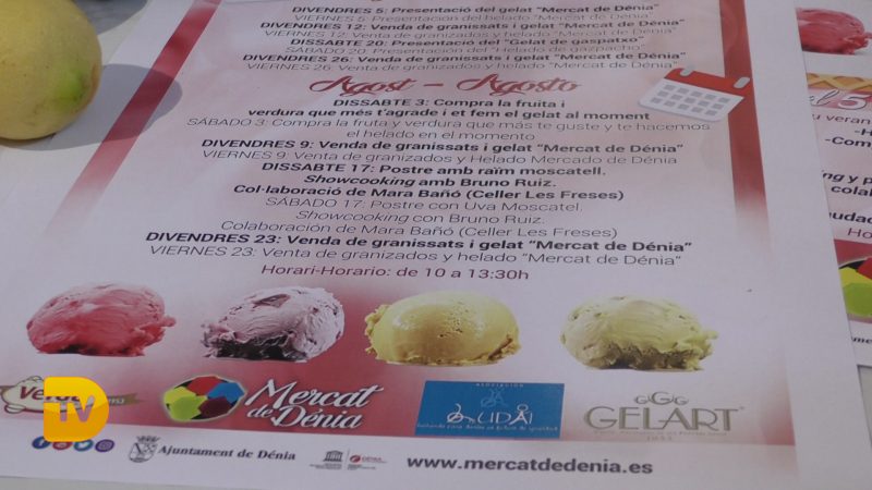 Agosto se iniciará con otra interesante propuesta. El sábado día 3, se ofrece al público la posibilidad de comprar la fruta y verdura que prefiera en los puestos del mercado y los maestros artesanos de Gelart le elaborarán al momento un helado con estos ingredientes. Y el sábado 17, el cocinero Bruno Ruiz protagonizará un showcooking en el creará un postre con uva moscatel, en colaboración con Mará Bañó, propietaria de las bodegas Les Freses. Los viernes 9 y 23 de agosto se dedicarán a la venta de granizados naturales y el helado “Mercat de Dénia”.