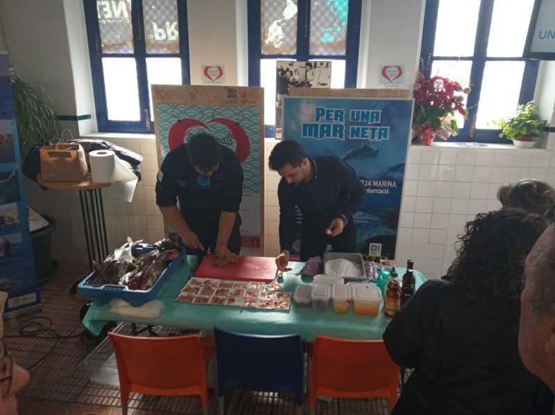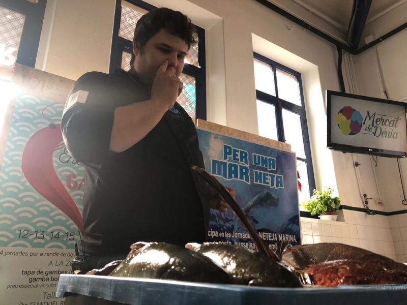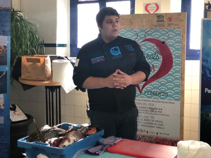 La campaña Enamorados de la gamba de Dénia ha celebrado hoy su segunda jornada en el Mercat Municipal. Cien kilos de gamba hervida preparados para servirse como tapa o para ser adquiridos en los puestos de venta de pescado del mercado y un taller de cocina protagonizado por el cocinero de La Xerna del Mar Héctor Nieto han sido las propuestas para el día de hoy.