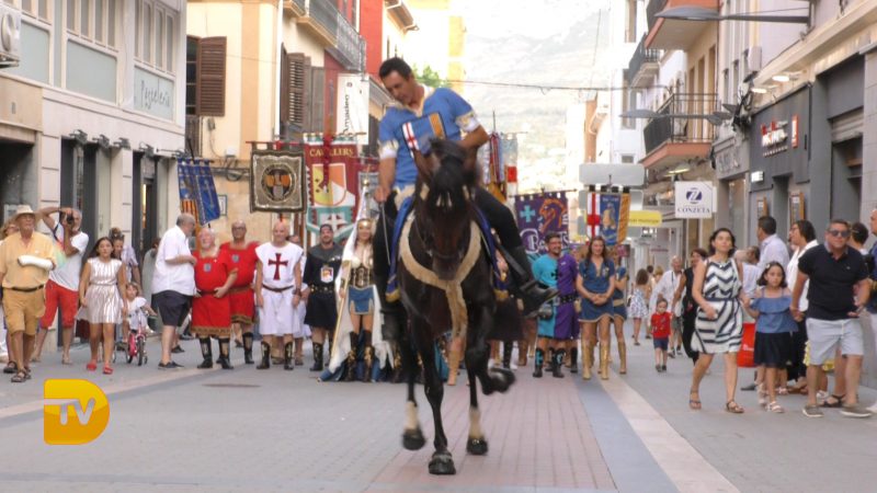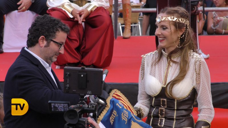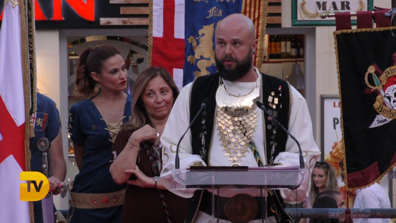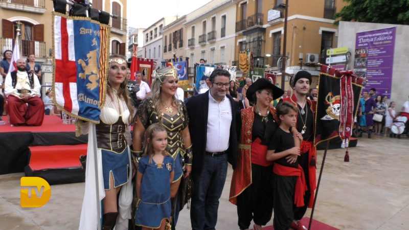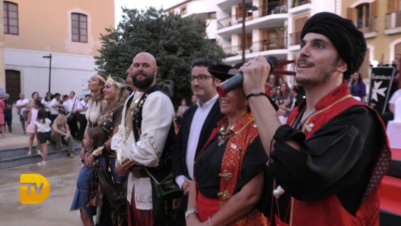 Los abanderados de las capitanías, Marcos Ferrer de la Filà Mora Piratas Berberiscas, y Marta Gascó de la filà cristiana Almogavers, alzaron sus voces para la izada de banderas que ya lucen en la plaza del Consell y en lo alto del Castillo.