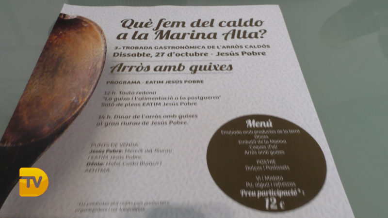 El 3r encuentro gastronómico del arroz caldoso ‘Què fem de caldo en la Marina Alta?’ entronca con la conmemoración del 80 aniversario de la Guerra Civil española y se dedica este año a un plato de la época de posguerra, ejemplo de la supervivencia en la cocina: el arroz con almortas. El encuentro, organizado por los ayuntamientos de Dénia, Xaló, Pego y Ondara, la EATIM de Jesús Pobre y la Asociación de Empresarios de Hosteleria y Turismo de la Marina Alta (Aehtma), tendrá lugar en Jesús Pobre el sábado 27 de octubre. La comida del arroz con almortas, cocinado por el equipo de ‘Al teu gust’, se servirá para 180 comensales en el riurau de Jesús Pobre, a las 14 horas. Completan el menú una ensalada con productos de la tierra, acitunas, embutido de Marina, cocas de aceite elaboradas con el trigo tradicional que vuelve a cultivarse en Jesús Pobre, dulces y pastissets. Todo regado con vino y mistela de Xaló. El precio de participación es de 12 euros y los tiques se pueden adquirir en la EATIM y el Mercat del Riurau de Jesús Pobre, el hotel Costa Blanca y las oficinas de Aehtma.