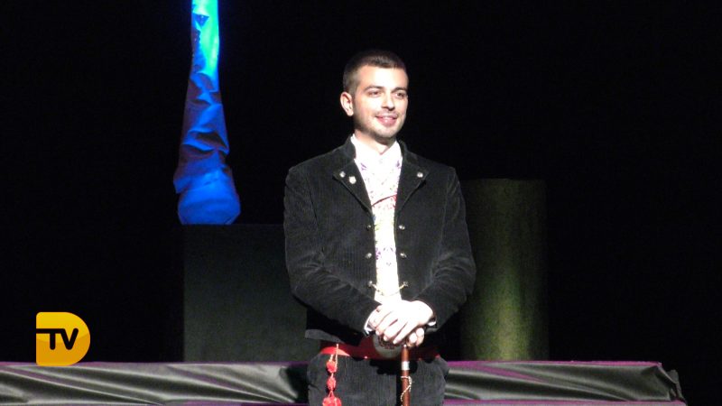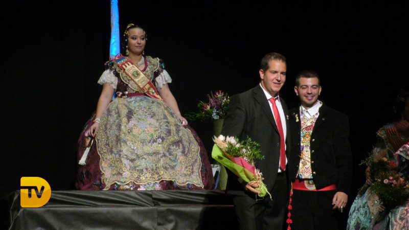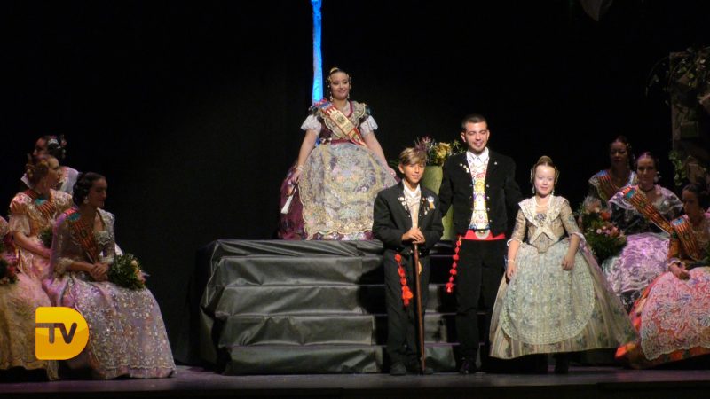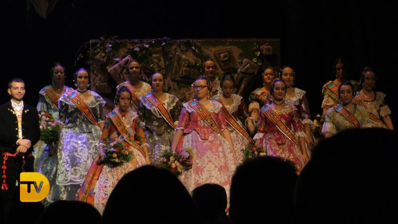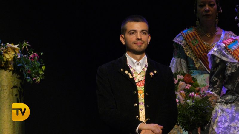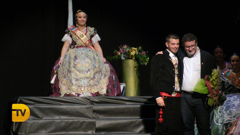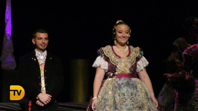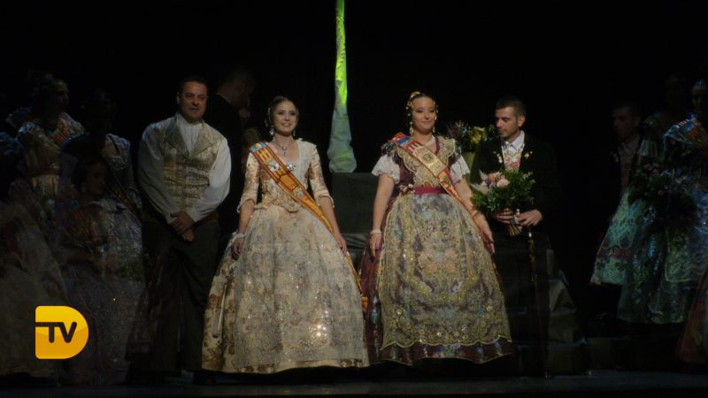 Pablo Garcia, president de la Falla Diana 2020 el primer a eixir a escena, seguit l’àmplia cort d’honor i la Fallera Major de Diana Judith Fernández Martí.