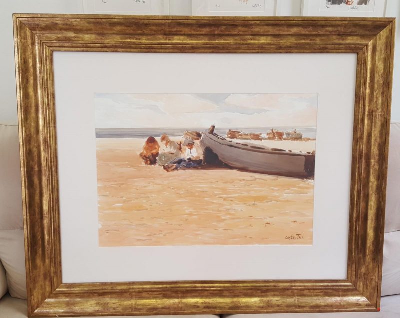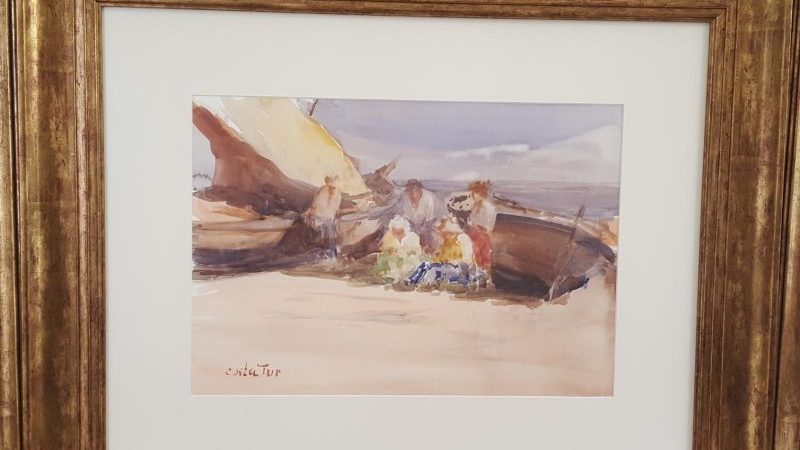 Se trata de dos acuarelas sobre papel, una de 35×50 cm y la otra de 50×70 cm, valoradas en 3.000 y 5.000 € respectivamente, pertenecientes a una de sus temáticas más queridas, las estampas costumbristas y pintorescas de la gente del pueblo junto al mar en sus tareas marineras diarias.
