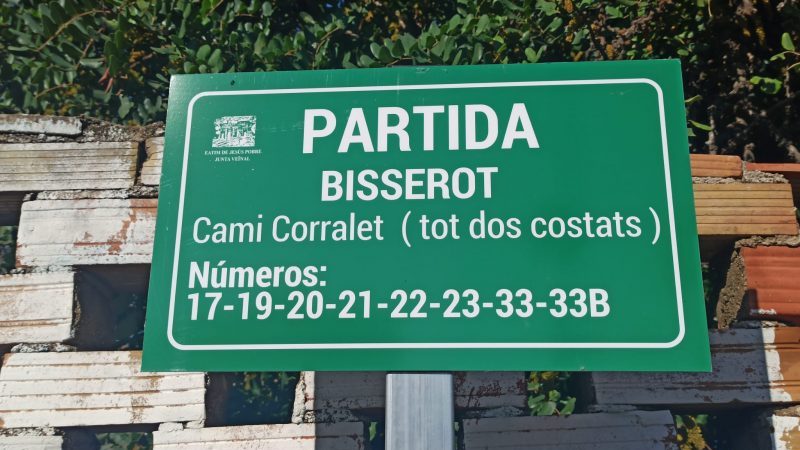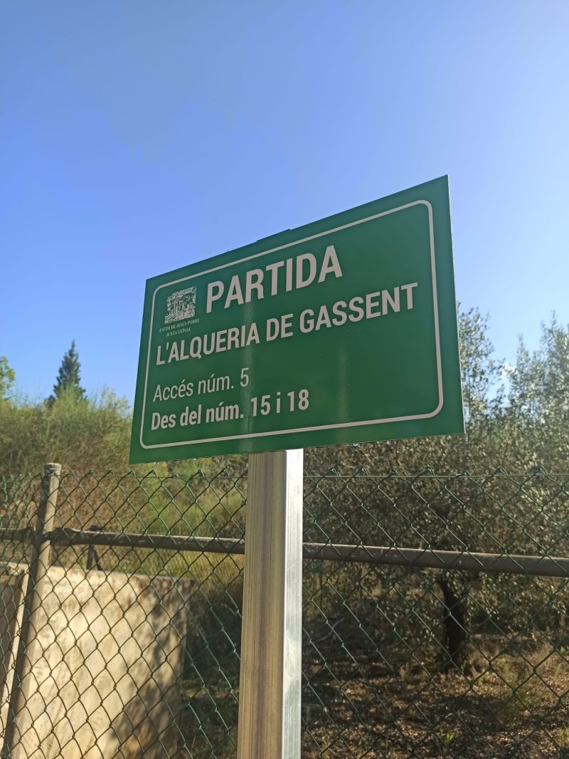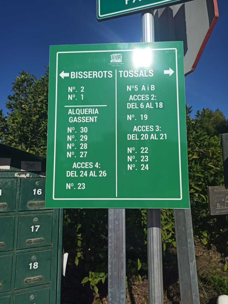 Ello ha posibilitado que con un presupuesto de 4.713,92 euros de la partida presupuestaria de 2020 para la adquisición de la señalización, y de 4.412.87 euros de ejecución de obra con cargo a los presupuestos de 2021, se ha conseguido fijar la información del diseminado correspondiente a Mitjans, Cova Ampla y Foyes Blanques, así como las partidas de Bisserot, Alquería de Colomer, Casa Leida, Alquería de Gassent, Tossals, Cases Noves, Capitanies y zona denominada específicamente como Jesús Pobre.
