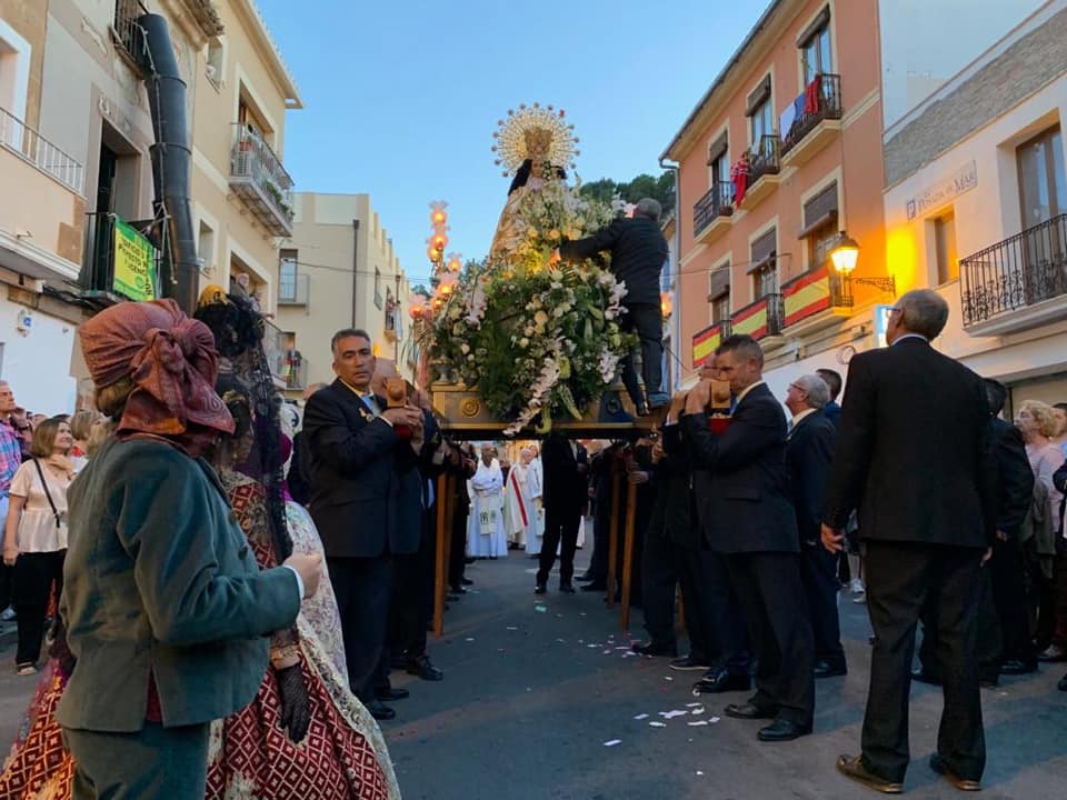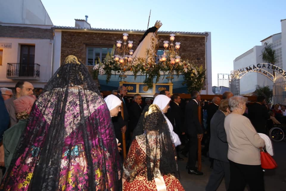 Com és tradicional, el tercer diumenge de maig, la Mare de Déu dels Desemparats aguaita en solemne processó pel carrer del Pont, a muscles de persones que la porten amb il·lusió, mentre pètals de roses se li ofereixen des dels balcons. A la porta del casal de Baix la Mar, els càrrecs 2020, Juan Vi Lull, Núria Ivars, Paula Pastor i Cesc Llácer, vestint les gales falleres, esperen a la “Geperudeta” per a fer-li els honors en nom de la comissió marinera. Es curiós l’exercici faller s’inicia i acaba ofrenant a la Verge dels Desemparats, perquè ella és la patrona dels mariners de Dénia i nosaltres estem lligats a la mar. A més a més, és emocionant escoltar des de la porta del nostre casal, les sirenes dels vaixells dels mariners que les fan sonar amb força, en un particular concert.