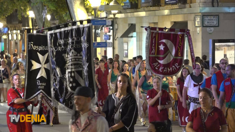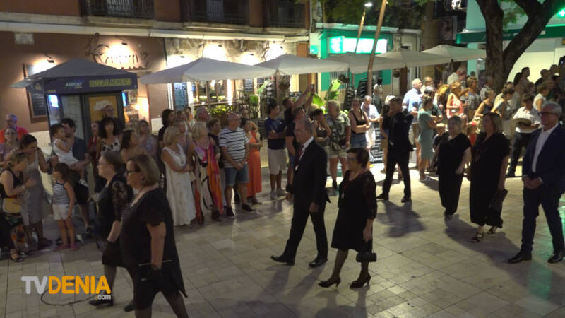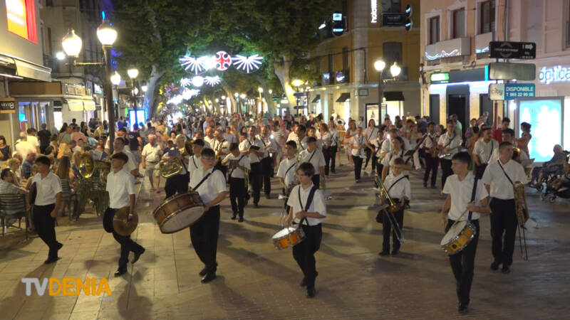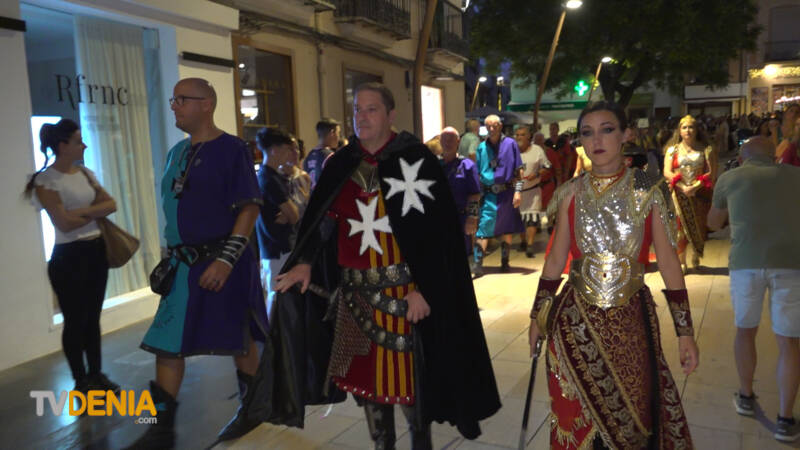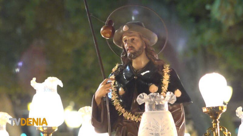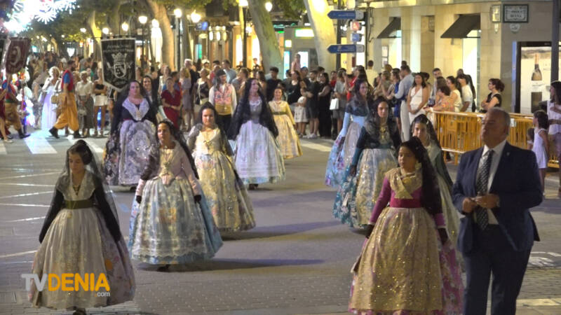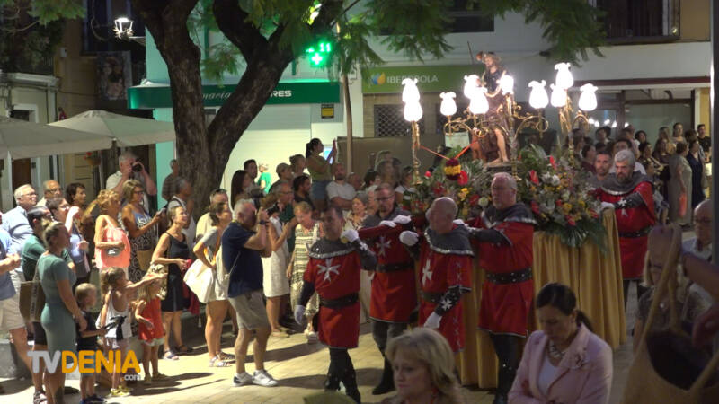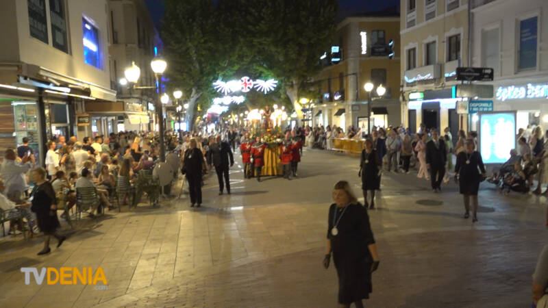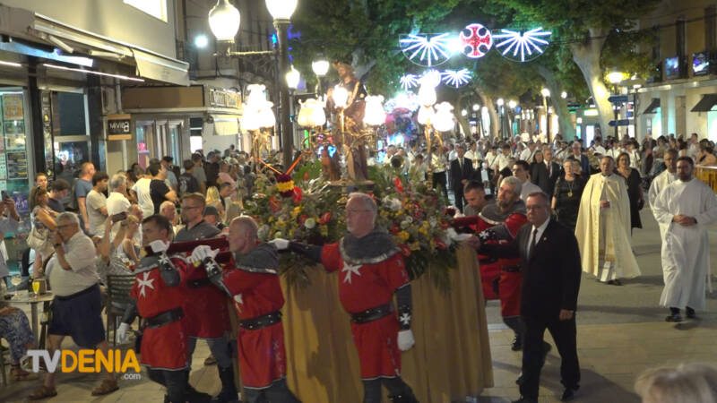 Por la tarde , era el momento de la procesión , donde representantes de la fiestas, vecinos y visitantes acompañaron a la imagen, que fue llevada a hombros por miembros de la Filà Guerrers Hospitalaris, acompañados por la música de la Agrupación Artística Musical de Dénia.