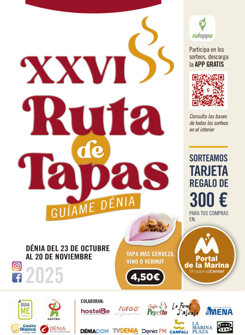La 26 edición de la Ruta de Tapas de Dénia, que organiza GuiaME Comunicació con la colaboración de Turisme Dénia y la Asociación de Empresarios de Hostelería y Turismo de la Marina Alta (AEHTMA), se celebra del 23 de octubre al 20 de noviembre de 2025. Un total de 49 establecimientos concursantes ofrecerán su tapa más una bebida (cerveza, vino o vermú) a un precio único de 4,50 euros.