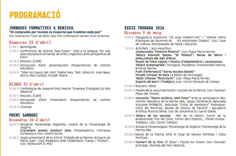 El programa d’activitats de la XXXIX Trobada d’Escoles en Valencià de la Marina Alta, que se celebrarà a Dénia el dissabte 9 de maig, arranca aquesta vesprada amb l’acte de lliurament del Premis Sambori 2026 a l’auditori del Centre Social. A partir de les 18 h, la Muixeranga Segarieta i la seua xicalla donaran la benvinguda als assitents a una gala presentada per L’Estranya Companyia en què s’entregaran els premis comarcals de narrativa infantil en valencià.