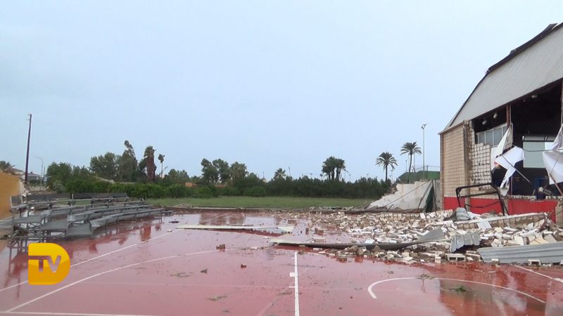 Otra de las imágenes más llamativas ha sido el pabellón del Polideportivo, donde el muro de la cancha de baloncesto y la misma pista de futbol sala, se ha ido al suelo, dejando a la intemperie la cancha. Trabajadores del pabellón salvaban ordenadores de la oficina y sacaban el material de las instalaciones.