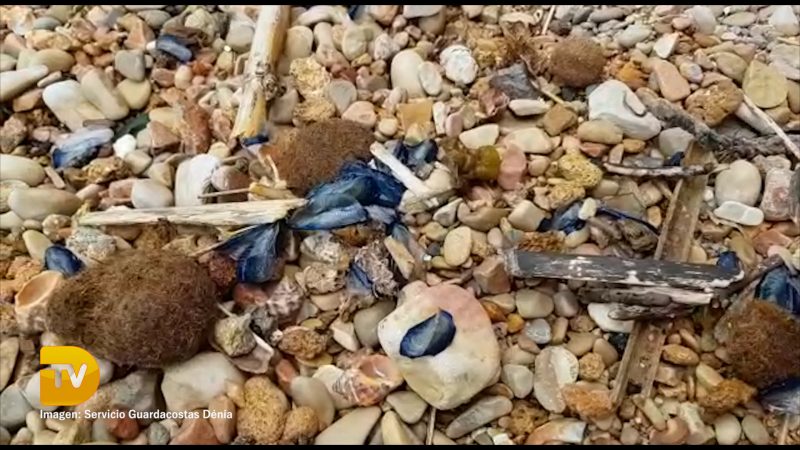 Este viernes, una persona que vive en las Rotas, paseando al perro ha visto la costa llena y al desconocer de que se trataba avisó al servicio de Guardacostas Dénia. Ellos verificaron que se trataba de Medusas de la especie Vellella Velella.