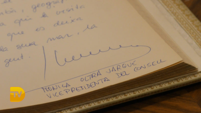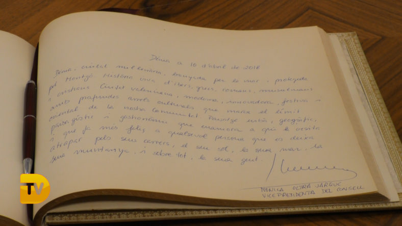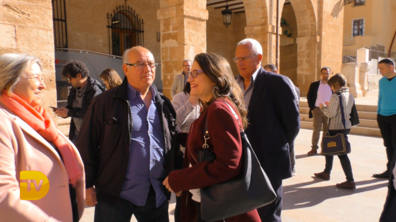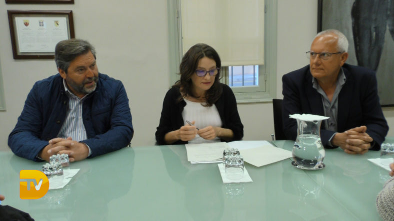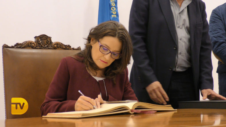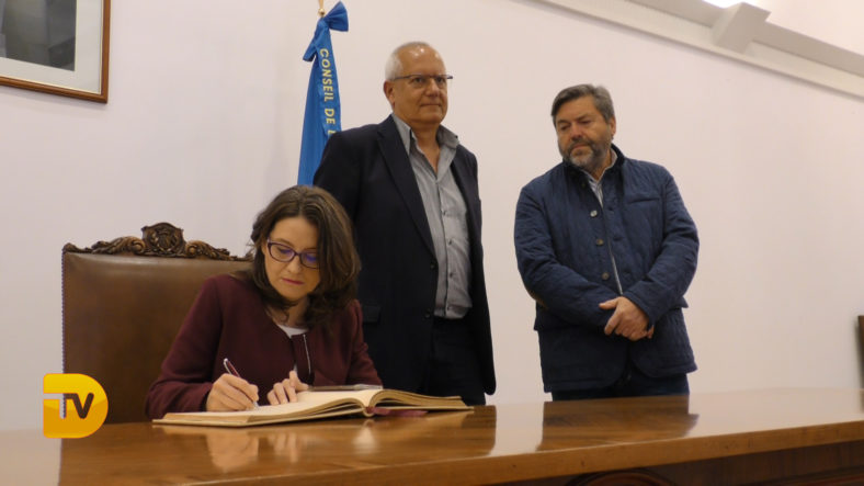 La vicepresidenta del Consell y consellera de Igualdad y Políticas Inclusivas, Mónica Oltra, ha visitado hoy Dénia en una jornada de trabajo que ha comenzado con un encuentro en el ayuntamiento con el alcalde, Vicent Grimalt, el vicealcalde, Rafa Carrió y otros miembros de la Corporación municipal. Tras firmar en el libro de honor de la ciudad y recibir, de manos del alcalde, un ejemplar del Título de Ciudad que el rey Felipe III otorgó a Dénia en 1612, Oltra ha mantenido una reunión de trabajo con los representantes de la Corporación presentes en el acto.