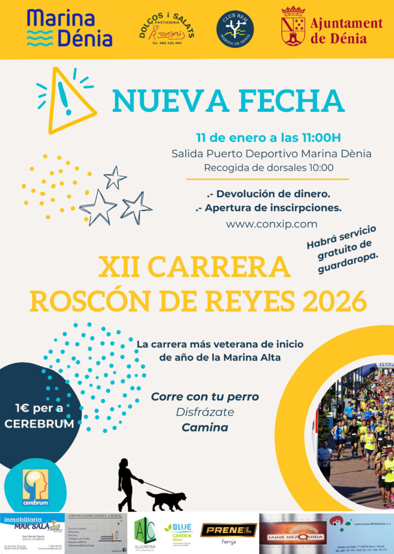 La 12ª edición de la Carrera Roscón de Reyes Marina Dénia, organizada por el Club de Rem Marina Dénia, que debería haberse celebrado el pasado domingo 4 de enero, tuvo que cancelarse por las lluvias y los fenómenos costeros. La organización ha decidido que la prueba se hará el próximo domingo 11 de enero.