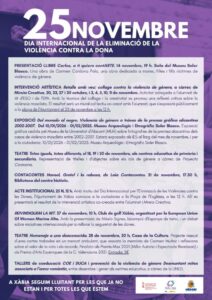 El programa del 25N incluye también la intervención artística “Retalls amb veu: collage contra la violència de gènere”, impartida por Mireia Creativa con alumnado de 4º de ESO y de la EPA. A partir de materiales gráficos de una reflexión crítica, el alumnado elaborará un mural colectivo que se presentará públicamente durante el acto institucional del 25 de noviembre, a las 12 h en la Plaça de l’Església.