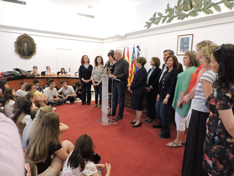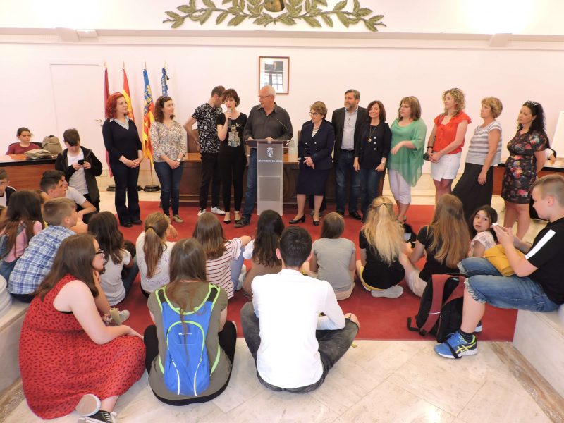 L’alcalde, Vicent Grimalt, i el regidor de Cultura i vicealcalde, Rafa Carrió, han rebut hui a la Sala de Plens de l’Ajuntament de Dénia al grup de representants dels centres escolars europeus que, amb el col·legi denier Pou de la Muntanya, participen en el projecte Erasmus+ 2018/2020 “The Sun and the Blue” fonamentat en la millora de les competències lingüístiques i la competència digital de l’alumnat.