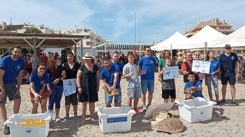 A la suelta de tortugas han acudido miembros de la Residencia de Santa Lucia de Dénia, Del colegio de educación especial Raquel Payà y del Centre Ocupacional de la Xara que han apadrinado una tortuga y les han puesto los nombres de Lucia, Rai y Alejandro.