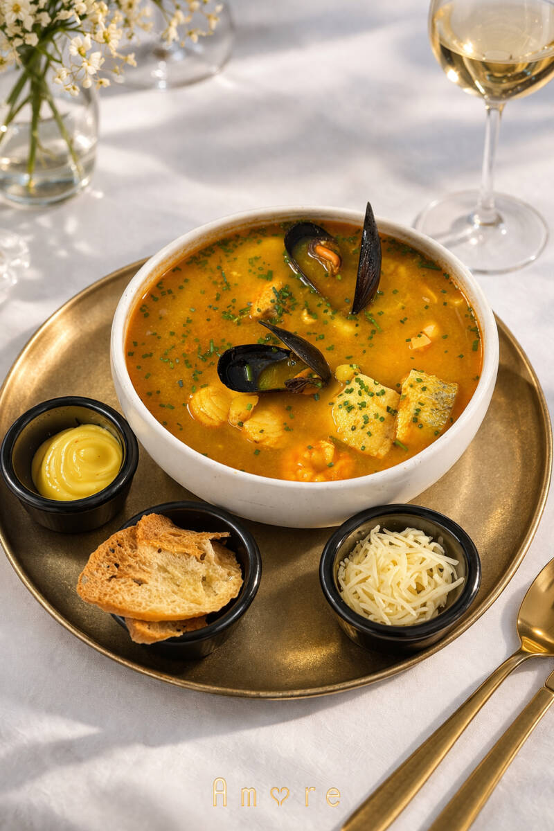 El restaurante propone un recorrido culinario en un entorno elegante, con vistas privilegiadas al puerto y al castillo de Dénia. El menú Isla Marina Dénia de AMORE consiste en una selección de entradas, entre las que se encuentra la ensalada “Amore”, con tomate premium, hierbas frescas, burrata, anchoas del Cantábrico, aceitunas de Aragón y albahaca fresca; ceviche de lubina y langostinos con crujiente de plátano macho; degustación de croquetas caseras de gamba roja y de jamón ibérico y huevo pochado sobre coulis de patata y dados de foie gras. Los principales están compuestos de los siguientes platos: “Bouillabaisse”, cazuela francesa de pescado de roca y langostinos; lubina al horno con salsa thai y arroz basmati; pollo del corral “Paris Palace” con salsa de brie trufado y champiñones o Couscous royal con cordero, merguez y ternera. Los postres del menú son: mousse de chocolate con almendra garrapiñada, toque de sal y aceite; frambuesas “Amore” con su helado de vainilla; “Calin” de sorbete de limón con cava o Espresso Martini.