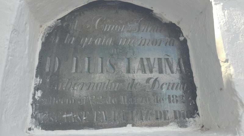 Tvdenia, acompaña esta crónica con algunas fotografías recientes, entre las que destacan las lápidas de D. Luis Laviña, quien fue Gobernador de Dénia, fallecido en Marzo de 1824, la de D. José Antonio Morand fallecido hace 202 años y la de D José Ferrándis, arquitecto nacido en Benasau en 1793 y cuyos restos yacen en el Cementerio de Dénia.