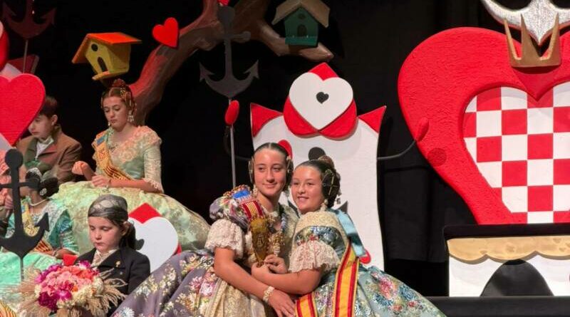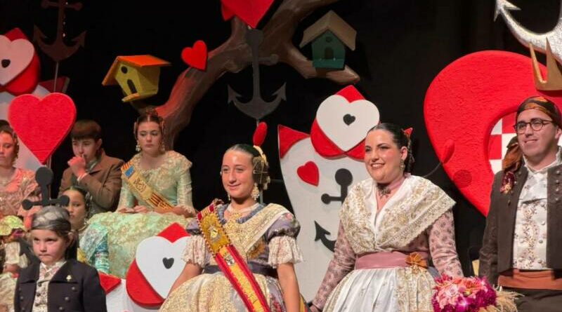 En primer lugar, Manuel recibió el bastón de Presidente Infantil de manos de su gran amigo Nicolás. A continuación, fue el turno de que los niños y niñas subiera al escenario. Y solo faltaba recibir a Chloé, quien, con los ojos llenos de emoción, recibió su estimada banda de las manos de su hermana Carla. Seguidamente, el Presidente Infantil la proclamó como Fallera Mayor Infantil, le impuso la banda y le libró la insignia de oro de la falla. Para finalizar este momento tan simbólico, Chloé colocó la pajarita al estandarte, acreditando así su reinado.