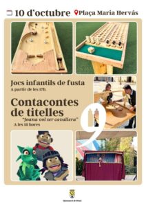 El viernes 10 de octubre, a partir de las 17 horas se harán juegos infantiles de madera para los más pequeños en la plaza María Hervás y, a continuación, a las 18 horas, el cuentacuentos de títeres Joana vol ser cavallera.