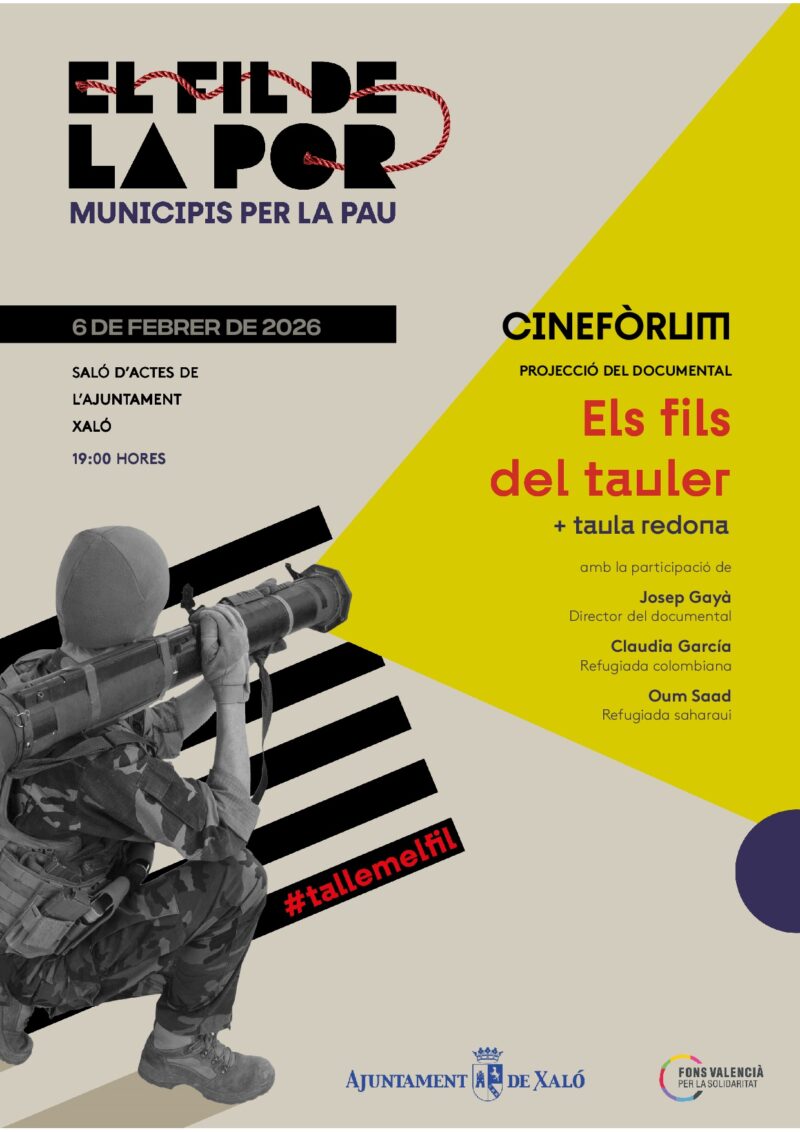 Por otro lado, en el marco del proyecto, se proyectará, para la ciudadanía en general (y también con entrada libre y gratuita), el viernes 6 de febrero, a las 19.00 h, en el Salón de Actos del Ayuntamiento de Xaló, el documental de investigación “Els Fils del Tauler” del Colectivo Mirades, el cual habla sobre las causas y consecuencias que generan los conflictos bélicos. La proyección del documental estará seguida de un espacio para la reflexión que contará con la participación de Josep Gayà, director del documental, de personas refugiadas protagonistas del documental (Claudia García, refugiada colombiana, y Oum Saad, refugiada saharaui), así como del público asistente. “Els Fils del Tauler” ha sido premiado como mejor documental en la categoría de mediometraje del Festival Internacional de Cine de la No-Violencia Activa.